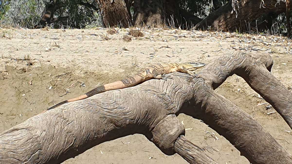 Second encounter was with a monitor lizard that I think was an adult sand goanna (Varanus gouldii). It was sunning itself on an exposed snag and retreated up a branch as I got near, trapping itself. It had an amazingly pattern on its body as if it was the canvas for a skilled Indigenous Australian artist to paint the sacred design belonging to an ancient Barkandji ritual. It was a mix of dot painting swirls and line art. I only managed a couple of poor photos on my phone while drifting with the current before I left it in peace hoping the photos would turn out ok.