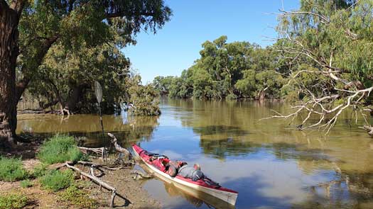 Main weir was still flowing, but I was greeted with a muddy shoreline. This was a bit perplexing as the main flood water was yet to reach the lakes but NSW Water was reducing the flow downstream. Someone suggested this was because of water quality issues to prevent brackish water being let out or something. I camped early to avoid reaching Menindee really late at night and I wanted to talk to the locals in the morning about transport options for the Darling Anabranch. In hindsight this was a bit of a mistake costing around 5 hours paddling time. There is some fairly unadvertised free camping just in Menindee () that would have allowed me to get much closer, saving the 21 km paddle in the morning. Camp was on a low shelf on the bank, probably the worst of the trip.