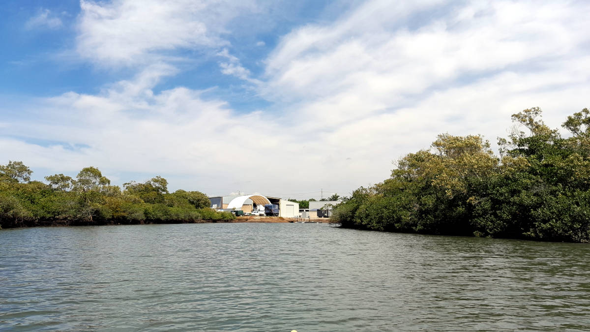 A wide shallow estuary lined by mangroves up to a tidal barrage at Stapylton Jacobs Well Rd.